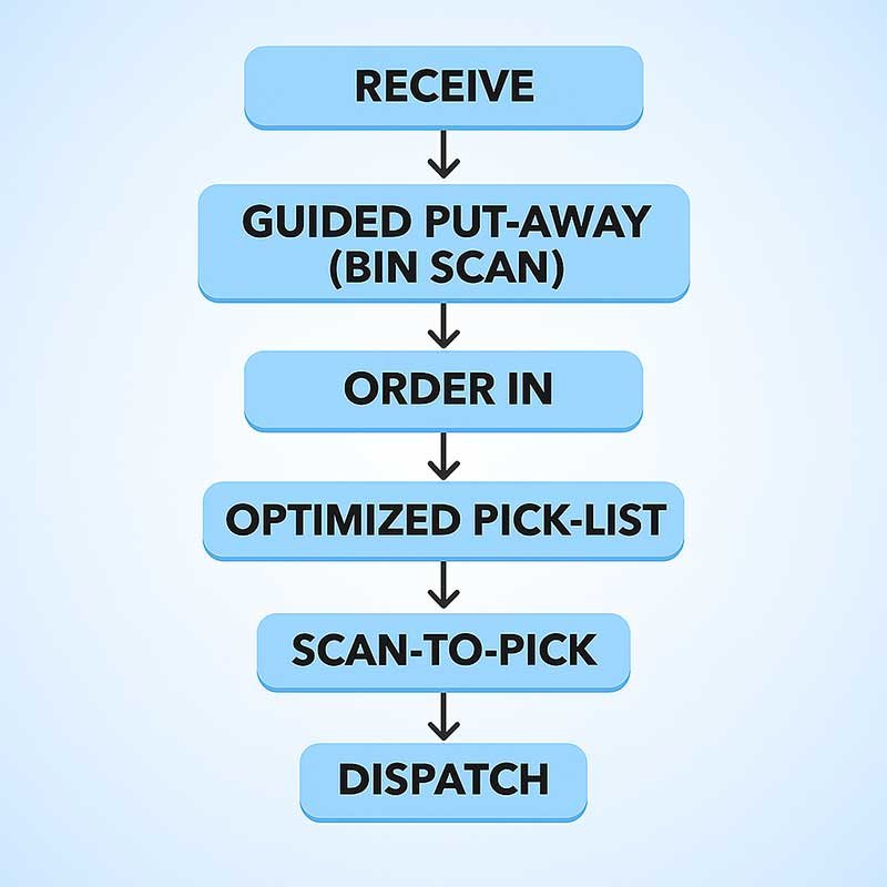 The system then directs your team on the most efficient path for every single task, using a mobile scanner. It replaces "tribal knowledge" with a 100% accurate, foolproof process.